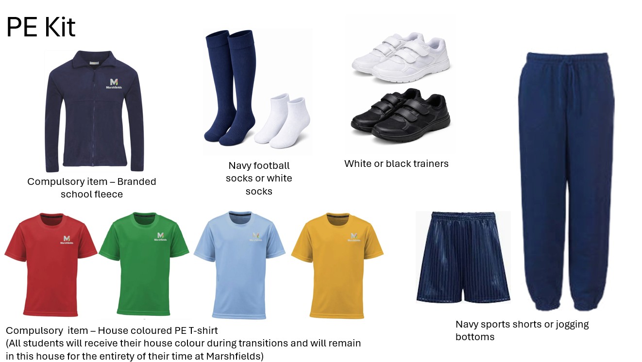 All students new to Marshfields from September 2026 must have these branded items. Students on role prior to September 2026 may continue to wear previous black branded school jumper and black PE uniform. There is no alternative fleece option allowed.